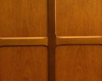 Mid-century teak sideboard featuring two cupboards, two drawers and central open storage, with slatted dividers. Good condition with some minor wear.