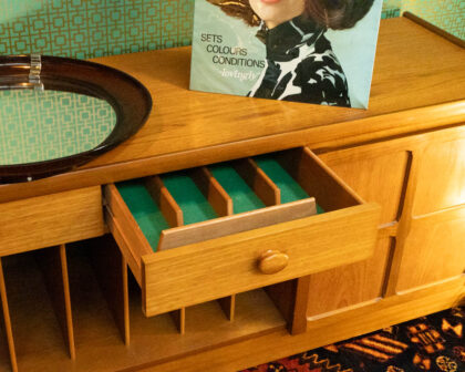 The sideboard is in good vintage condition, with some age-related wear. The wood has a warm, honeyed tone.
