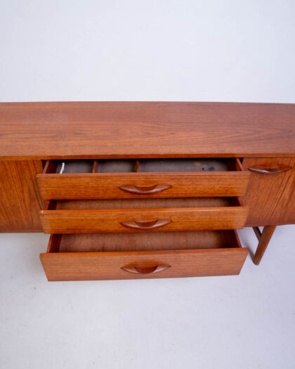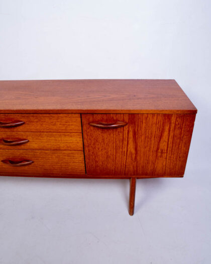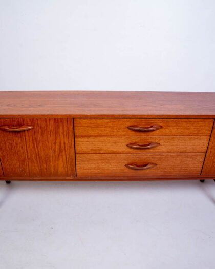 This is a stylish mid-century teak sideboard. The sideboard features a long, horizontal design with a smooth, flat top, ideal for displaying decorative items or serving food. Below, there are three drawers in the centre, each with sleek, curved wooden handles, and two doors on either side, providing ample storage space. The teak wood has a warm, brown tone with a visible grain pattern, giving the piece a natural and inviting feel. The sideboard stands on slightly tapered legs, a signature element of mid-century design. In good condition for its age, this teak sideboard would make a stylish addition to a dining room or living room.