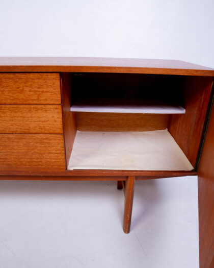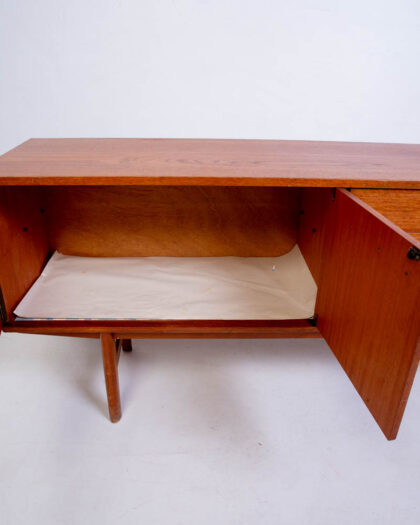 Mid-century teak sideboard. Features three drawers and two doors. Simple, elegant design. Minor scrapes and scuffs. Viewing is essential