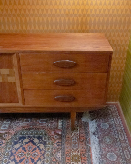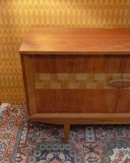Mid-Century teak sideboard with woven door detail. Features a bank of drawers to one side and a cupboard to the other. Good vintage condition.