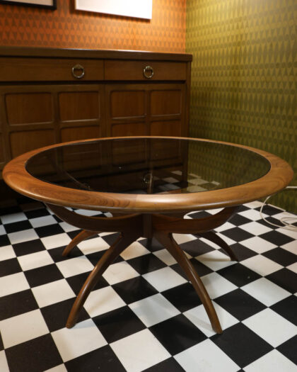 This stylish mid-century modern coffee table features a round smoked glass top, adding a touch of sophistication to any living space. The base is constructed from solid teak, with elegantly curved supports and tapered legs that showcase the clean lines and organic forms characteristic of the era. The smoked glass top provides a sleek and understated surface, while allowing the beauty of the teak frame to be seen.
