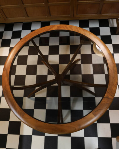 Round mid-century modern coffee table. Features a smoked glass top and elegantly curved teak frame. Excellent condition.
