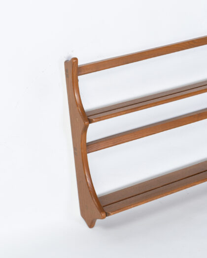 Mid-century teak wall shelf featuring three tiers for storage or display. Excellent condition. Classic design.