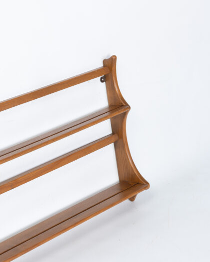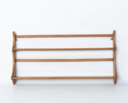 This mid-century teak wall shelf offers a stylish storage solution for any room. Constructed from beautiful teak wood, the shelf features three tiers, making it perfect for displaying books, plants, or decorative items. The clean lines and minimalist design are characteristic of the mid-century aesthetic. It is in excellent condition with minor signs of wear consistent with age.