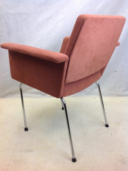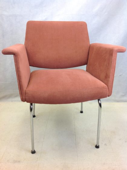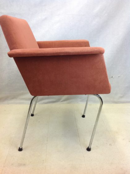 Beautifully styled chair with bright chrome legs and neatly upholstered seat and arms.