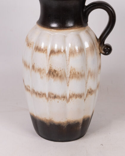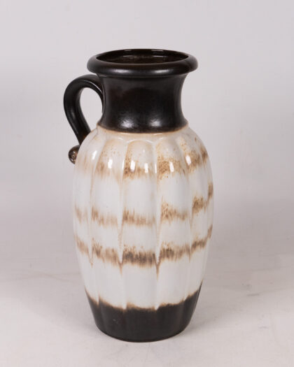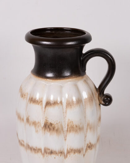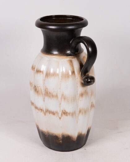 This is a beautiful, vintage West German pottery floor vase showcasing a distinctive mid-century modern design. The vase features a tall, slender body with vertical ridges, complemented by a curved handle. The colour palette includes a creamy white base, accented with horizontal bands of mottled brown. The neck and base are finished in dark brown/black glaze. Overall, the vase is in good vintage condition, displaying minor wear that is consistent with its age and use. This striking floor vase would make a superb addition to any mid-century modern or eclectic interior.