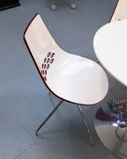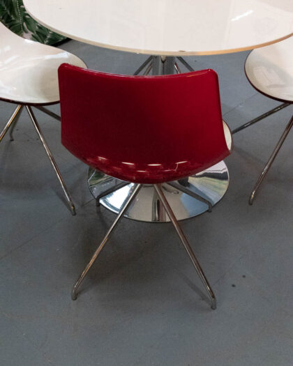A modern dining table with four chairs. Red and white plastic bucket chairs with metal legs, and a white circular table top on a chrome base.
