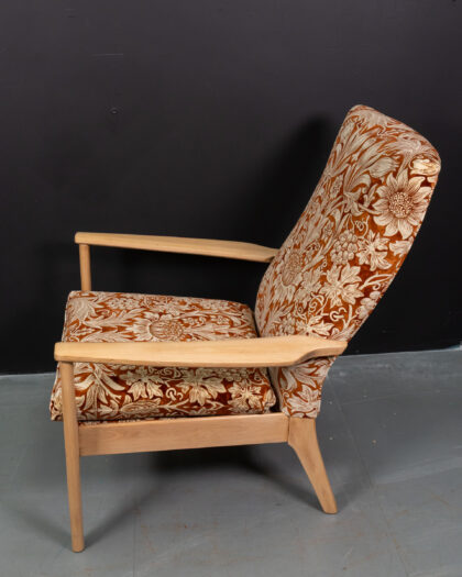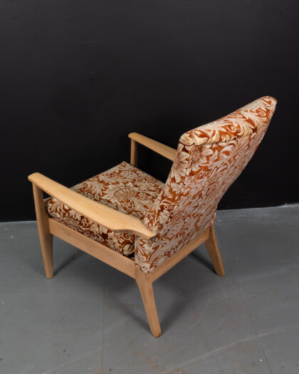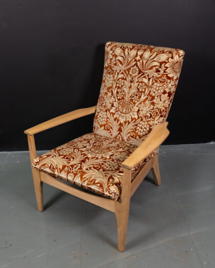 This stylish mid-century armchair features a light-toned wooden frame and has been freshly upholstered in a beautiful floral fabric from Morris & Co. The chair is in excellent condition and shows little sign of wear. This piece combines classic design with the timeless elegance of Morris & Co., making it a comfortable and decorative addition to any living space.