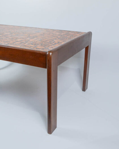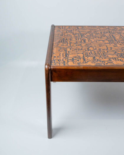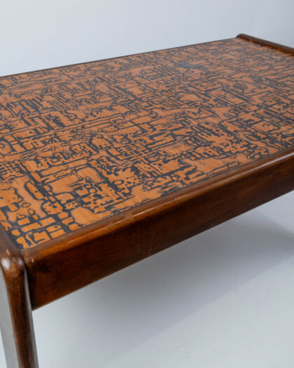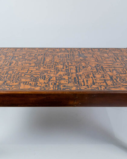 Mid-Century Modern coffee table with wooden frame and copper top featuring a linear abstract pattern. Good condition with some wear to the wood.