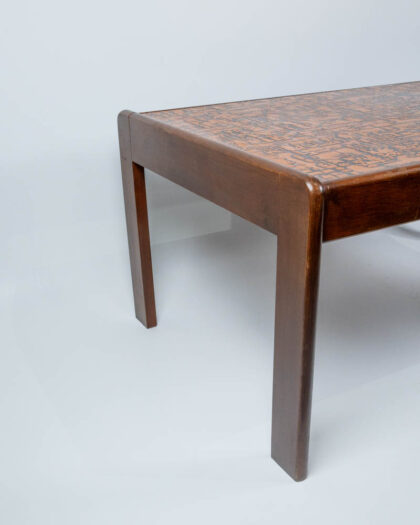 This Mid-Century Modern coffee table features a sturdy wooden frame and a unique copper top. Arranged to create a linear abstract pattern in orange and black tones, giving the table a distinctive and eye-catching look. The wooden frame has a warm brown finish. There are signs of wear to the wood, commensurate with age. This table would be a great addition to a living room or lounge area, offering both style and functionality.