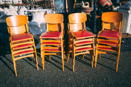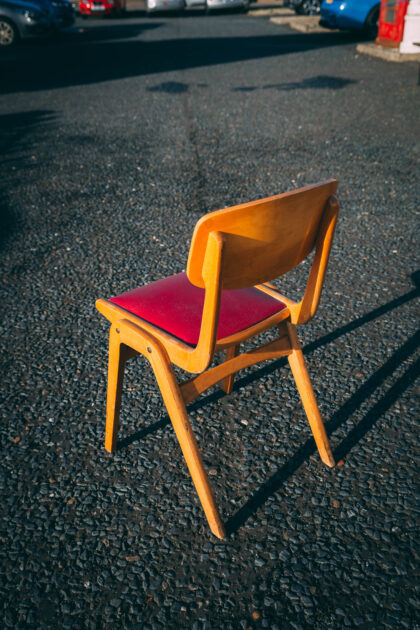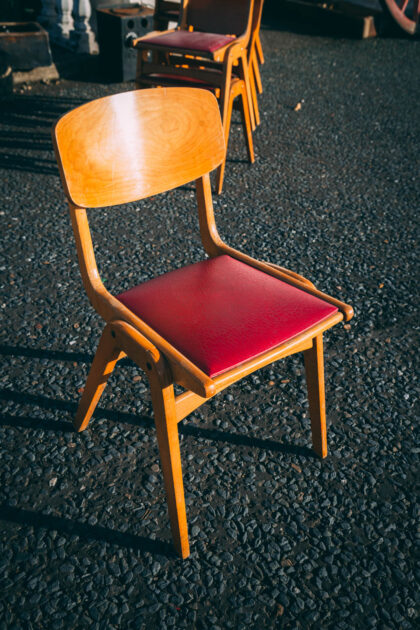 Very desirable authentic 60's style in a robust blonde wood chair with padded seat, safely stacking up to four-high.
