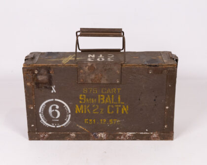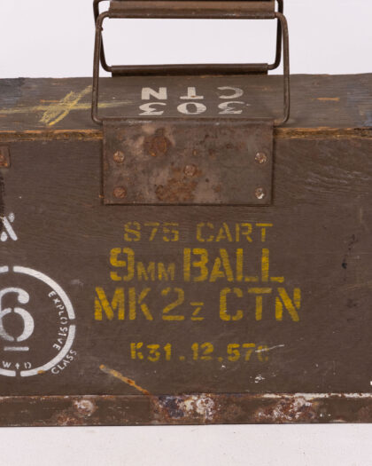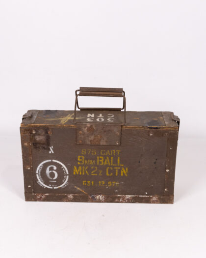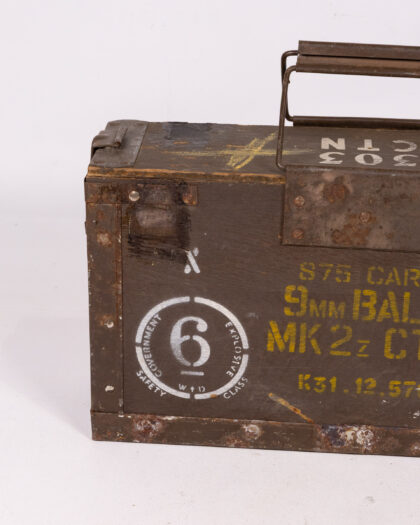 This is a vintage military storage box. The box is constructed from wood and reinforced with metal edges. It features a metal handle on top for carrying. The box is painted in green with yellow stencilled markings which indicate it was used for 9mm ammunition. The markings include 'S75 CART 9MM BALL MK 2z CTN K31.12.57'. There is a white stencilled circle which contains the number 6 and the words 'Government Safety Explosive Class W+D'. The box is weathered with signs of age and use, including rust and paint wear, which add to its vintage charm. The interior is unpainted, revealing the natural wood. The lid can be removed fully. It would make a nice decorative item or for military memorabilia collectors.