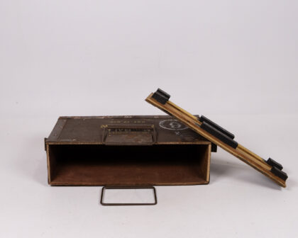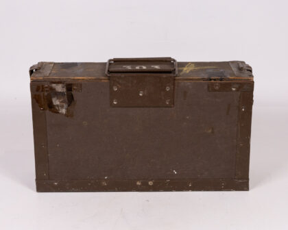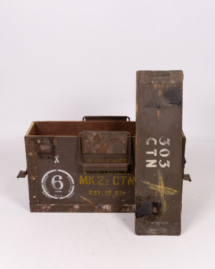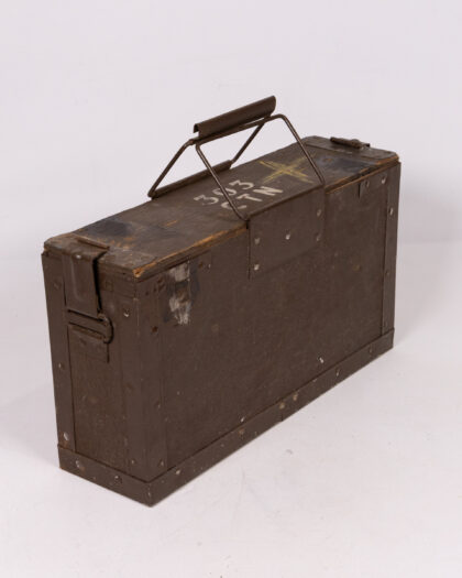Vintage military ammunition storage box. Features metal hardware, carry handle, and bold stencilled military markings. Great for storage or display.