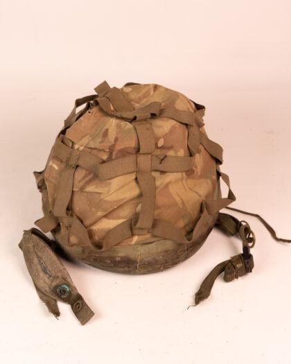 A vintage military helmet with a camouflage pattern, featuring adjustable straps.