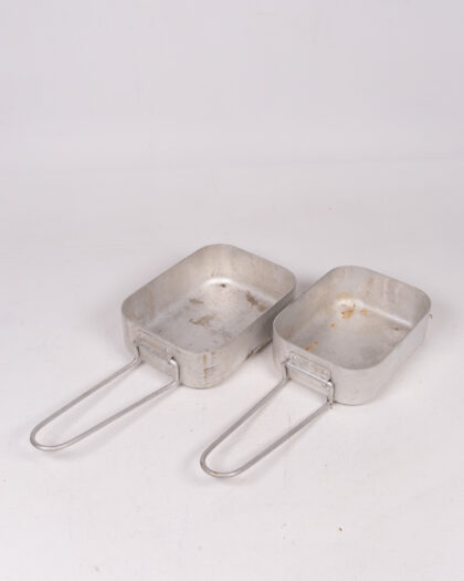 Vintage military mess kit with aluminum containers and folding handle. Perfect for collectors or reenactors.