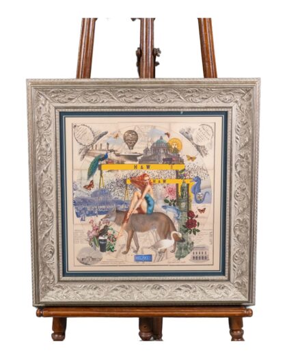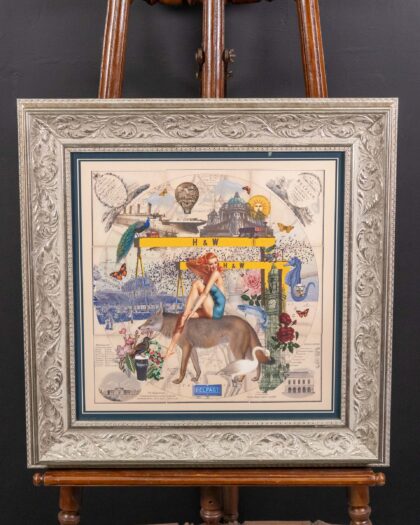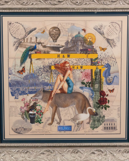 This framed print features a collage by Myrtle and Mary depicting iconic images of Belfast. The print incorporates images of the Titanic, Samson and Goliath cranes, Belfast City Hall and other Belfast images. The artwork is mounted inside a decorative silver coloured frame, with a blue border. This piece would be perfect in any room of the house adding a unique and artistic touch. In excellent condition.
