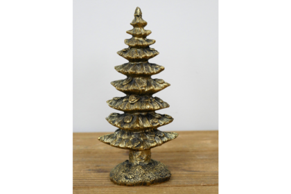 This is a brand new Christmas tree ornament crafted from resin with a metallic gold finish. The tree features a tiered design, reminiscent of stacked, stylized petals or leaves. It has an intricate, textured surface that enhances the details.
