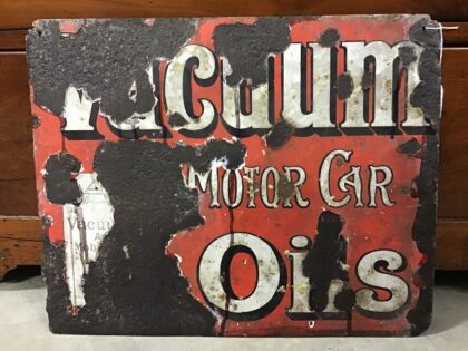 A Mobiloil "Vacuum Motor Car Oils" double sided red enamel sign, white lettering.