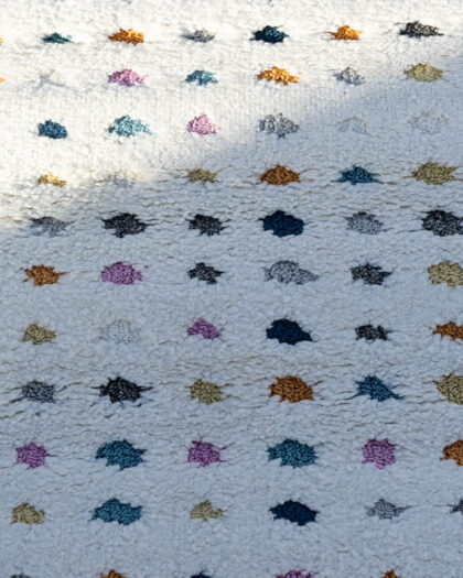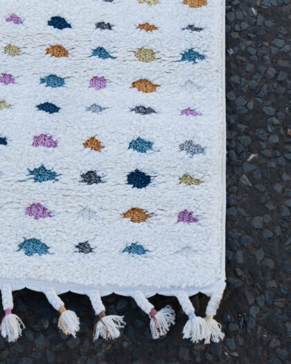 This is a modern Moroccan rug with a soft wool pile. The rug features an ivory base with colourful geometric tufting in blue, pink, orange and grey. The rug has white tassels at each end.