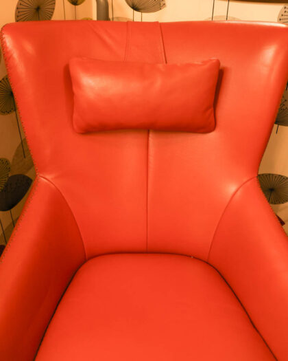 This is a modern swivel armchair upholstered in orange leather. The chair features a high back with an attached headrest cushion for added comfort. The leather has some marks commensurate with use. The chair stands on a metal swivel base. This chair would be a stylish addition to a living room or home office, providing a comfortable and contemporary seating option.