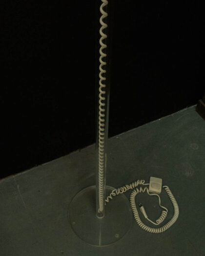 This modernist floor lamp features a white plastic lampshade in a flared trumpet shape. It stands on a clear plastic base, with a distinctive spiral stem made from a transparent plastic tube encasing a white coiled cable. The base is a clear circular plastic disc. The lamp is in good condition, showing some signs of light use. It would be perfect for use in a living room, home office or bedroom.