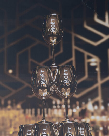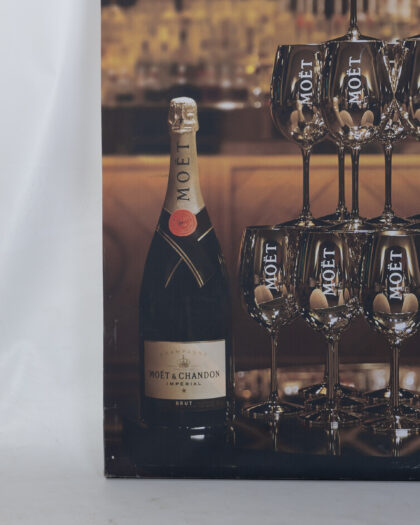 Moet & Chandon photographic print. Features Champagne bottle and glass tower. Good condition. Ideal for bar or lounge decor.