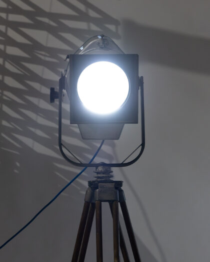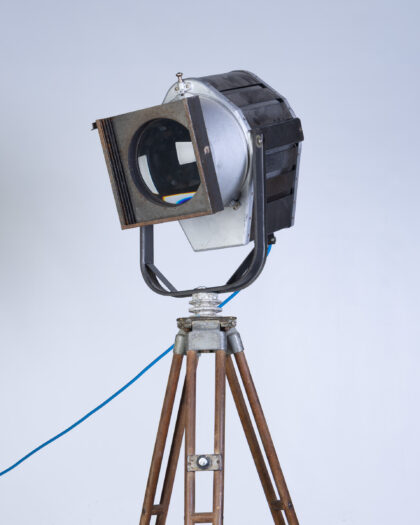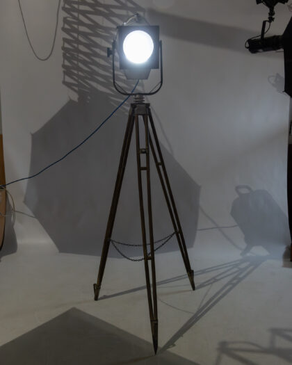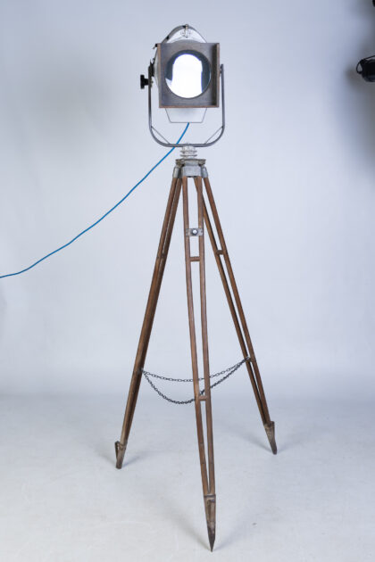 Vintage Mole Richardson Type 408 studio spotlight lamp on wooden tripod stand. A unique lighting solution with a retro industrial style.