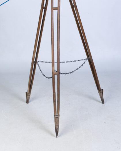 Vintage Mole Richardson Type 408 spotlight lamp on a wooden tripod stand. The spotlight features a cast metal housing with a fresnel lens and adjustable barn doors. The stand is made of wood with metal hardware, including chains to prevent the legs from spreading too far apart. This is a fantastic item, ideal for adding a touch of vintage to a living space. This spotlight is in very good condition for its age. There may be some signs of wear and tear, but this only adds to the character of the piece. Some marks and scuffs are present on the spotlight. The tripod has some wear to it. The spotlight has been rewired and is in working condition.
