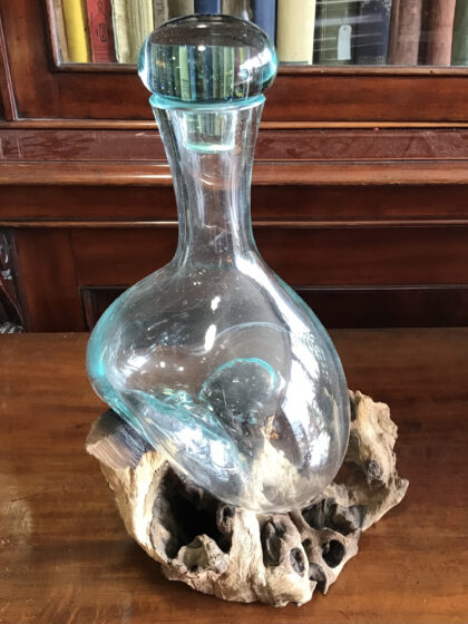 A piece of rootwood where glass has been melted over it and blown into a decanter. Complete with a glass lid.