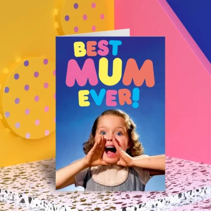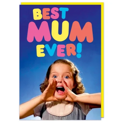 This Mother's Day card is designed to bring a smile with its vibrant colours and retro-inspired design. The card features the message "Best Mum Ever!" in a playful, bold font, set against a bright blue background.