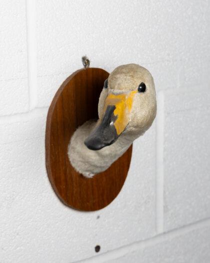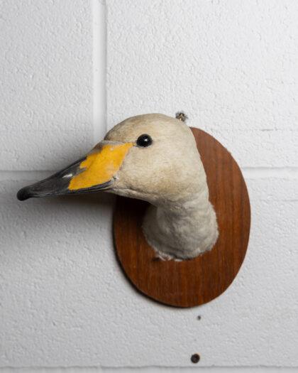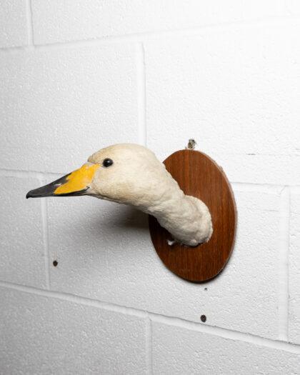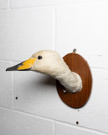 This mounted taxidermy swan head features a realistic design, crafted with attention to detail. It is mounted on a wooden plaque, ideal for adding a touch of nature to your home or office decor. The piece is in good condition, showcasing the swan's distinctive features, including its characteristic beak and plumage. Measurements are approximately 30cm in length and 15cm in width. Suitable for collectors or as an eye-catching wall display.