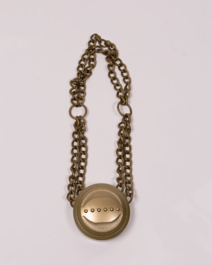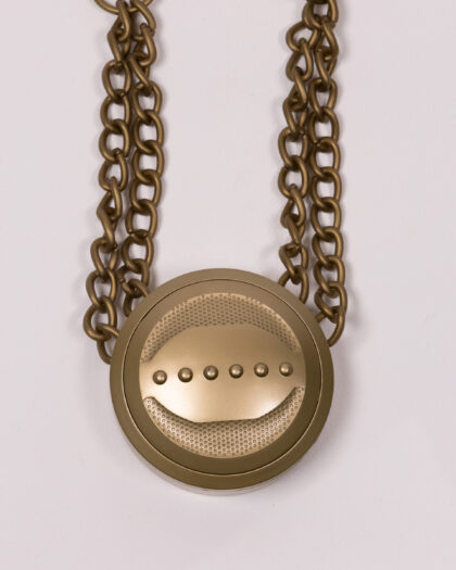 This is a Mr T Talking Medallion, a novelty item featuring the iconic character Mr. T. It is gold in colour with a chain, dating to the 1980's. It has an on/off switch to the reverse and speaker holes. Requires batteries (not included). Overall condition is good.