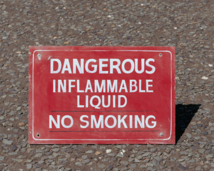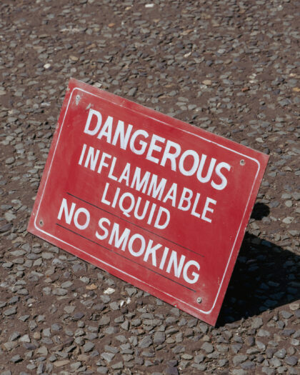 A metal sign that reads, "Dangerous Inflammable Liquid No Smoking".