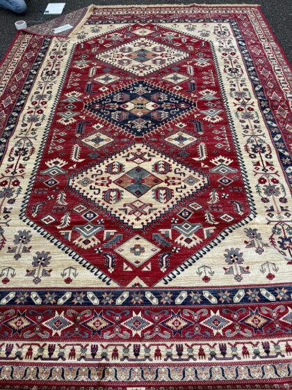 Multicoloured field full pile cashmere carpet with Aztec diamond medallion design.