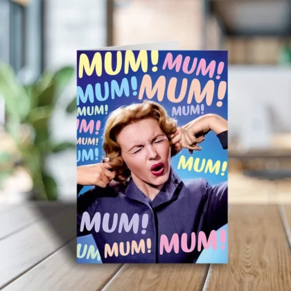 Mother's Day greeting card with 'Mum!' print design on pink background.