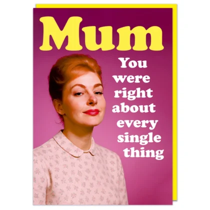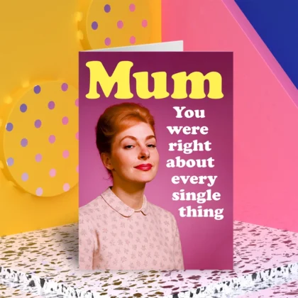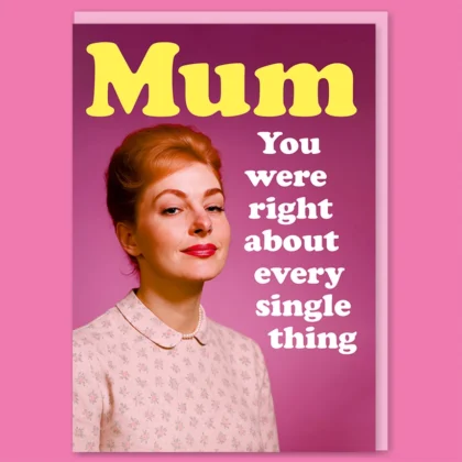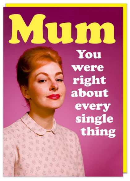 Mother's Day card with a retro image of a woman and the humorous message 'Mum, You were right about everything'.