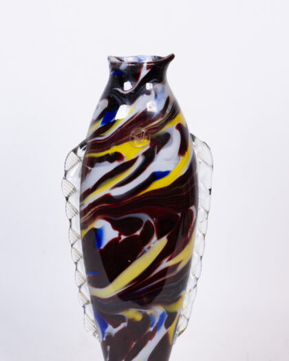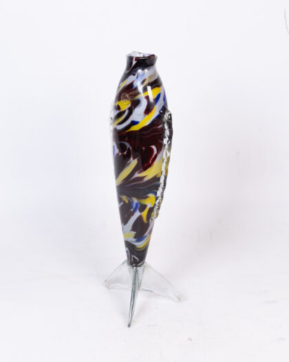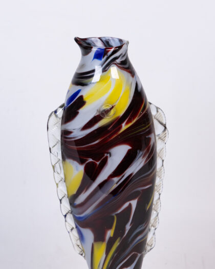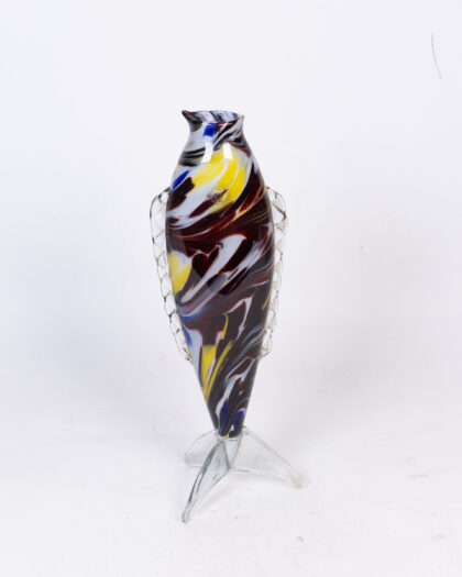 Eye-catching Murano-style art glass fish vase. A beautiful mouth-blown glass vase featuring an array of colours that swirl together, creating a unique effect. This charming ornamental vase is shaped like a fish and has decorative glass 'fins' as well as a clear glass base and stand.