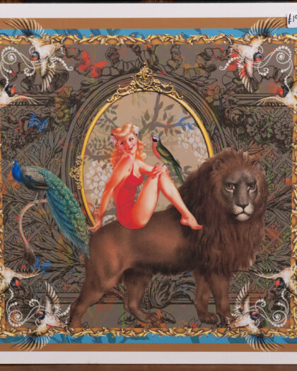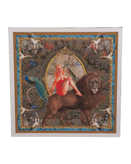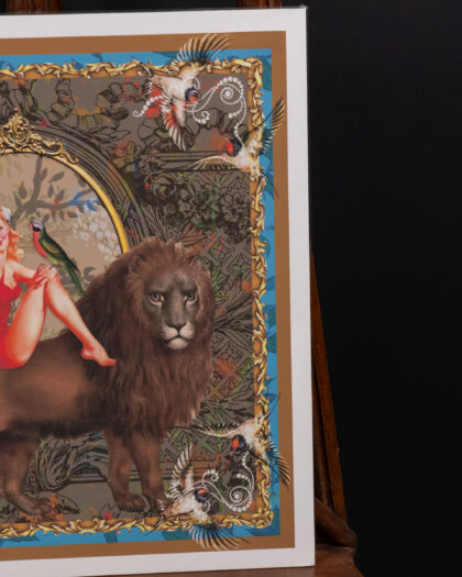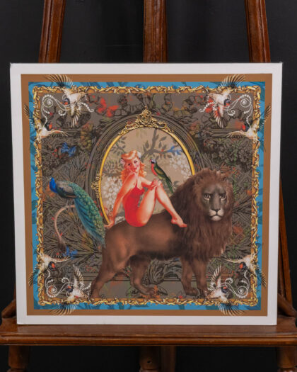 This striking canvas art print by Myrtle and Mary features a unique and surreal design. A pin-up style woman sits atop a majestic lion, with a peacock adding a splash of color. The print is framed by an ornate border, creating a visually rich and intriguing piece. The canvas is stretched over a wooden frame, ready for immediate display. It is in great condition and will make a statement in any room. Perfect for adding a touch of whimsy to your decor. The artwork combines vintage pin-up aesthetics with a surreal twist. A great conversation starter and a beautiful addition to any home.