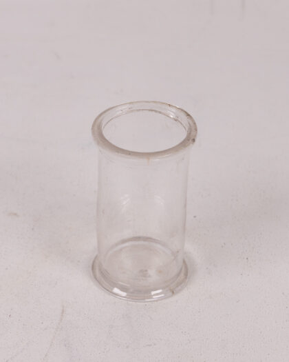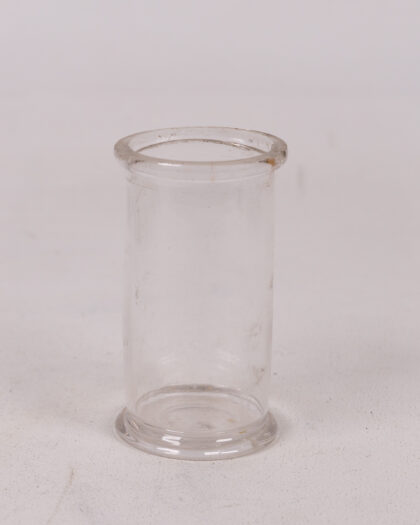 A clear glass chemist specimen jar. This would have originally had a lid but the lid is no longer present. The glass is clear and without major chips or damage. There are some slight marks and signs of use. It is of a cylindrical shape with a clear, smooth finish. A great piece for any collector of pharmaceutical items.