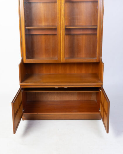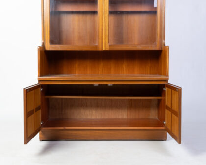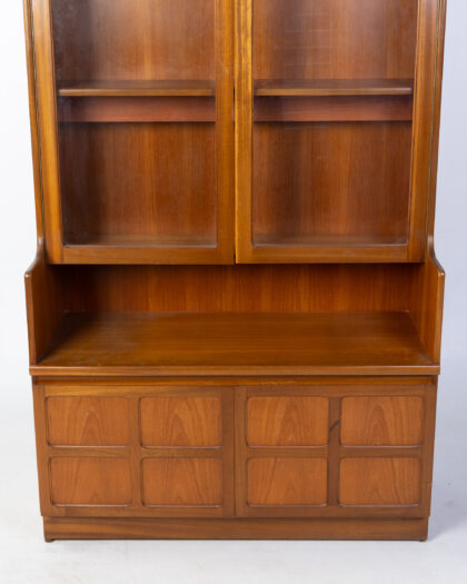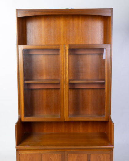 Vintage Nathan Furniture room divider cabinet. Teak wood display unit with glass cabinets and storage. Classic Mid-Century style.