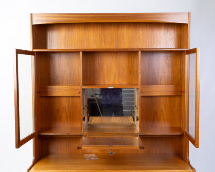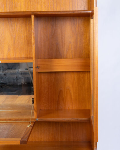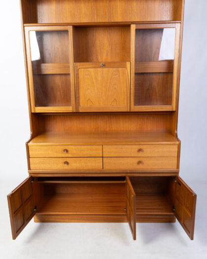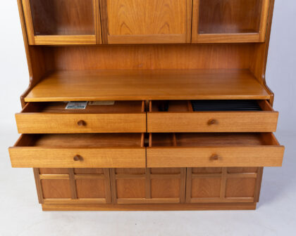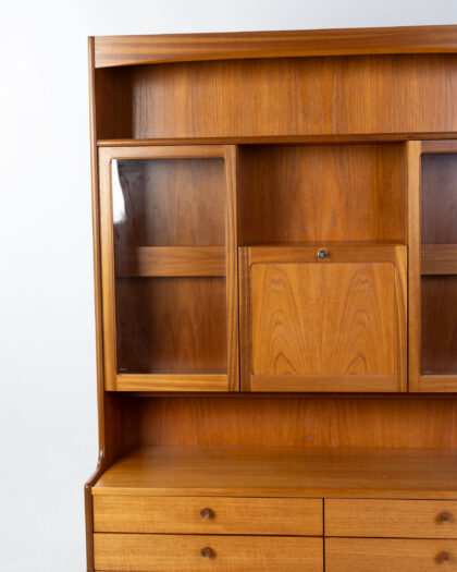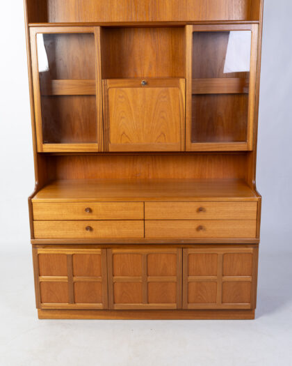 Discover this authentic Vintage Nathan Mid-Century Teak Room Divider Cabinet, a versatile piece designed to enhance any modern or classic interior. Crafted from rich teak wood, this elegant unit functions as both a stylish display cabinet and a practical room divider. It features two spacious glass display sections perfect for showcasing cherished items, alongside a clever pull-down bureau cabinet that offers a compact workspace or hidden storage. Below, a bank of four smooth-gliding drawers provides ample organization, complemented by three lower storage cupboards adorned with a distinctive vertical design across their doors. In very good vintage condition, this Nathan piece exemplifies timeless design and exceptional craftsmanship, making it a functional and beautiful addition to your living room, dining area, or home office.