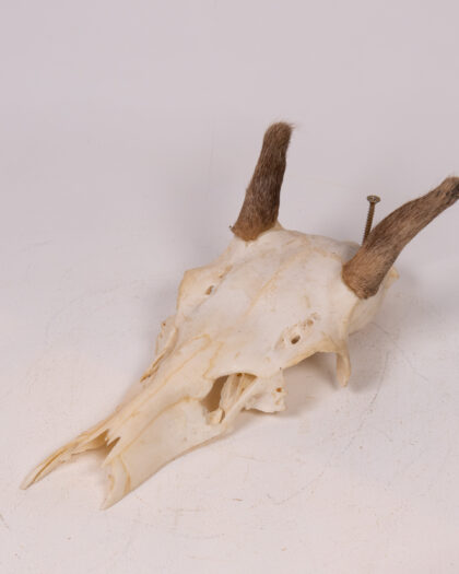 A naturally sourced goat skull, complete with its original horns, makes a unique decorative piece. The skull is cream coloured and displays natural imperfections due to age. The horns are brown and in good condition. Fixings are present. Makes a quirky and unique decorative item. Great as a gift for a collector or for halloween.