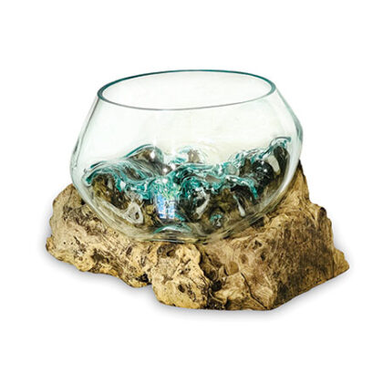 Stylish glass bowl with melted glass feature on a natural driftwood base. A unique, hand-crafted decorative piece for any living space.
