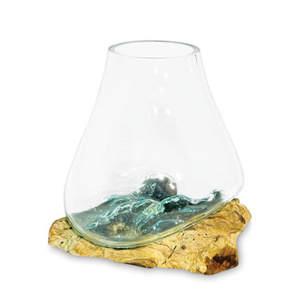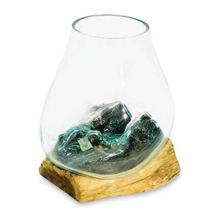 This is a clear glass vase with an organically shaped form, resting on a rustic wooden base. Within the clear glass, embedded at the base, are turquoise and green glass pieces, adding a touch of colour and visual interest. The wooden base has a natural, unfinished appearance. This item is hand crafted so each one is unique in appearance and may differ from the image shown. All sizes and weights are approximate. Please note: Not to be used with any heat source, candles etc.
