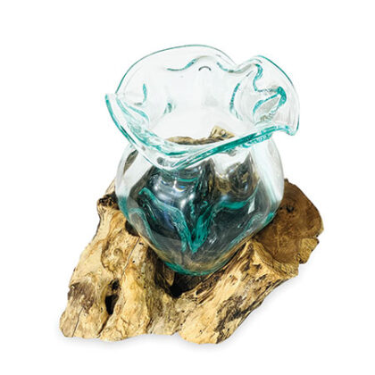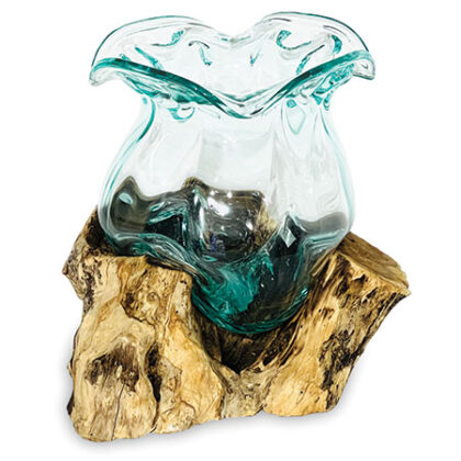 Handcrafted clear green-tinted molten crinkle glass bowl on a natural wood base. Unique, decorative accent piece. W 24 x D 19 x H 15 cm