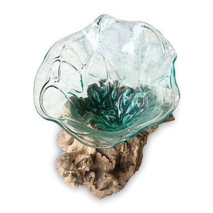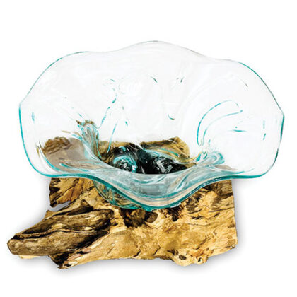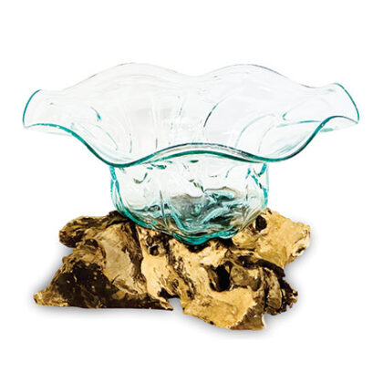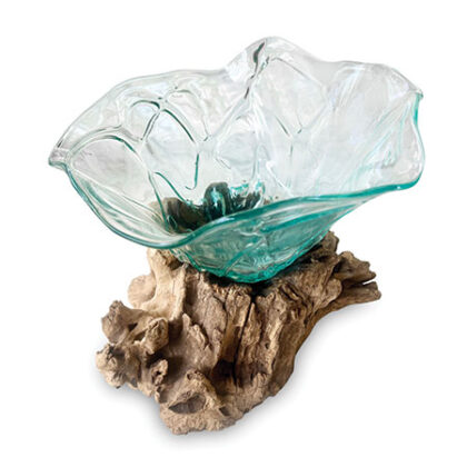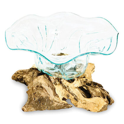 Hand-crafted molten glass bowl with a flower shape sits atop a natural root wood base. Unique appearance; sizes are approximate.