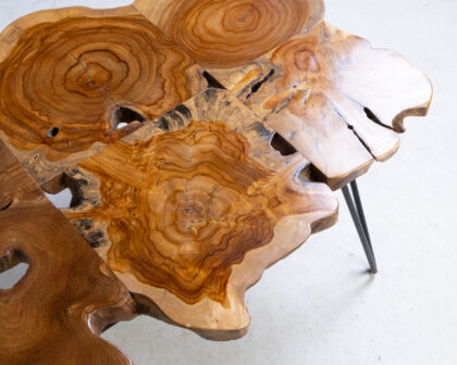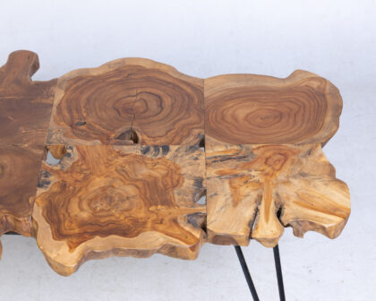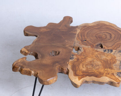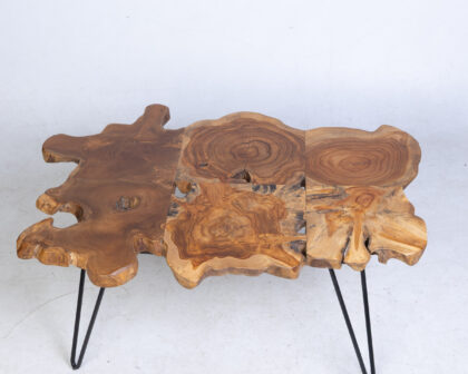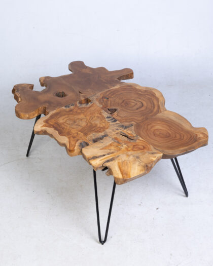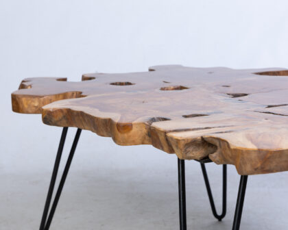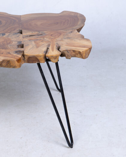 This striking coffee table features a natural-edge wooden top that showcases the unique grain patterns and organic shape of the wood. This coffee table is supported by sleek, hairpin-style metal legs in black that provide stability and add a modern touch to the design. It can be used as a centrepiece for a living room, lounge area, or snug. It is sturdy, reliable and aesthetically appealing.