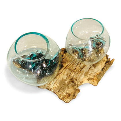 The sculpture measures approximately W 39 x D 22 x H 39 cm. The combination of natural wood and clear glass creates a visually appealing contrast, adding a touch of rustic elegance to any space.
