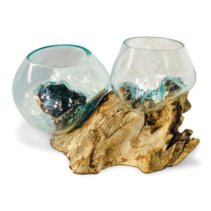 Hand-crafted wood root sculpture featuring two clear glass vases. Each piece unique in appearance. Sizes are approximate.